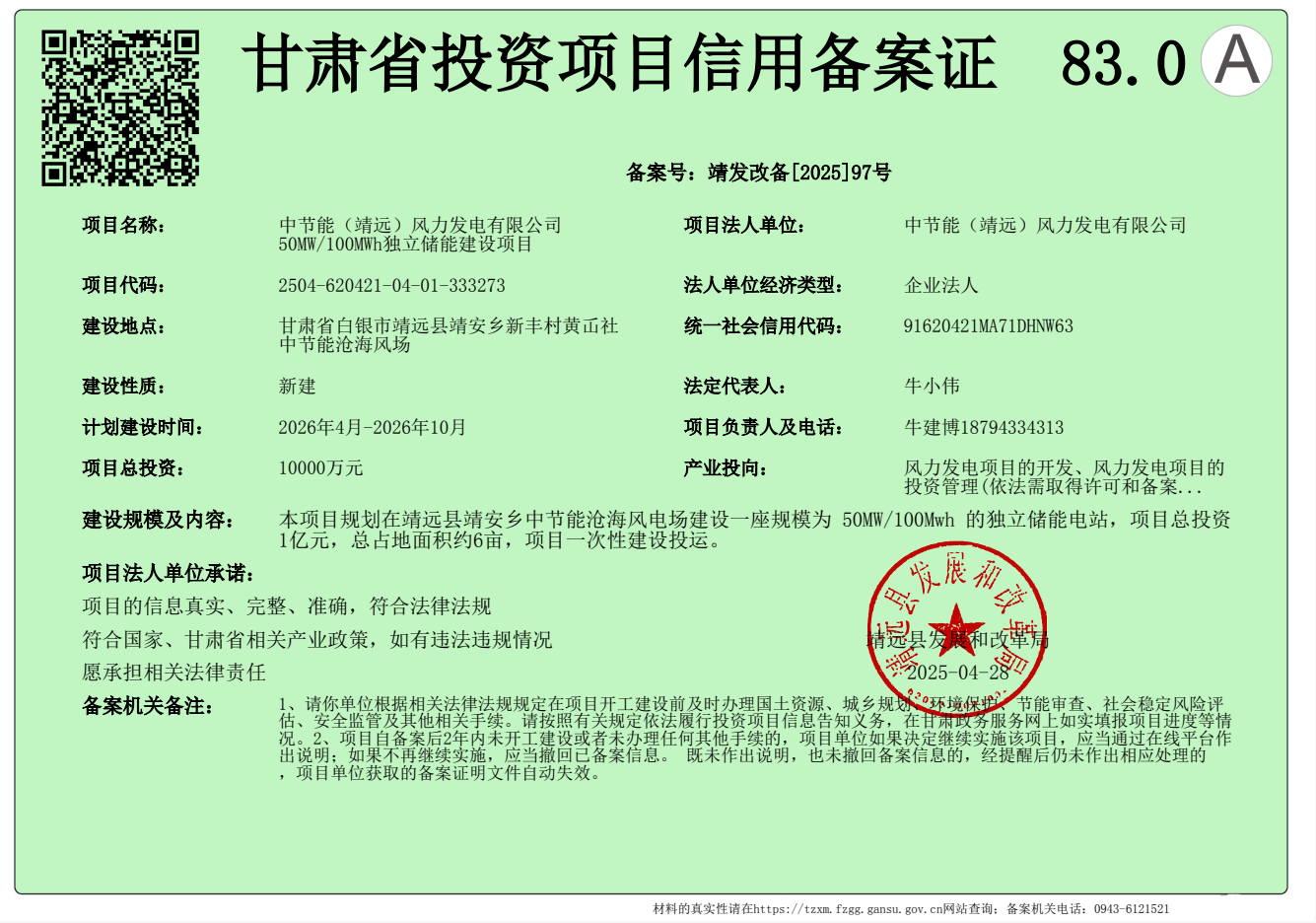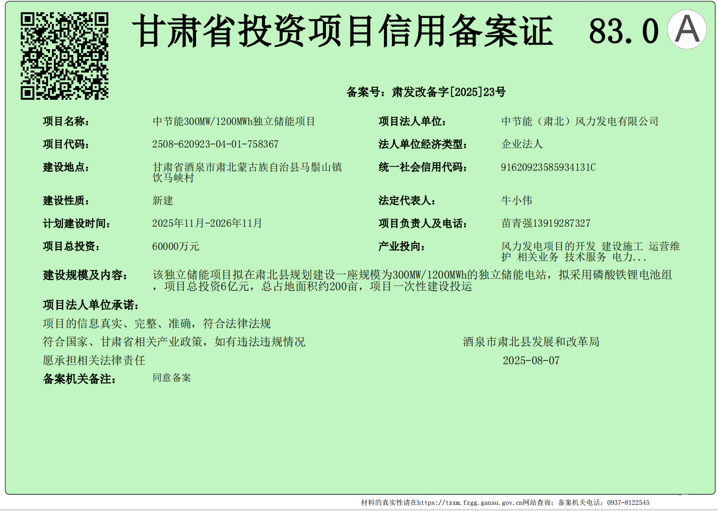 8月7日,风电公司肃北县300MW/1200MWh独立储能项目取得甘肃省酒泉市肃北县发展和改革局下发的《甘肃省投资项目信用备案证》,是风电公司积极探索“风电+相关多元”开拓新领域新业务的重要成果。